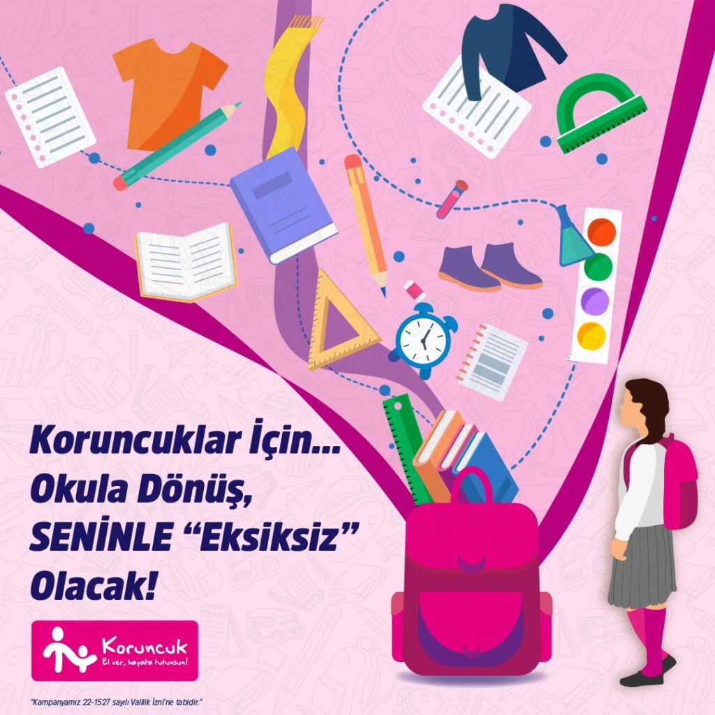 Koruncukların 2022-2023 eğitim – öğretim yılı okul ihtiyaçları için “Okula Dönüş” kampanyasını hayata geçirdik. “Okula Dönüş, SENİNLE “Eksiksiz” Olacak!” vurgusuyla başlattığımız “Okula Dönüş” kampanyasına bağışlarınızla katılarak; Çanta, Giyim, Teknoloji paketleri ile kırtasiye malzemelerinden çantaya, kıyafetten tablete Koruncukların eğitimlerine destek, heyecanlarına ortak olabilirsiniz.