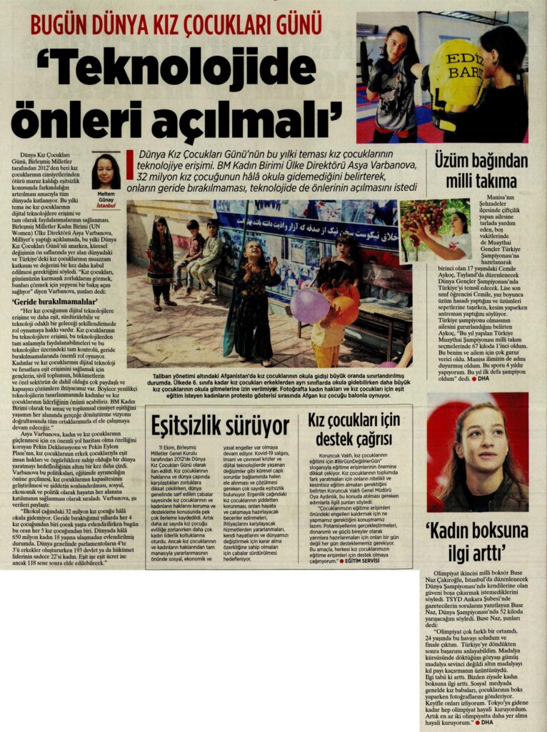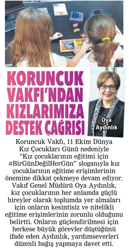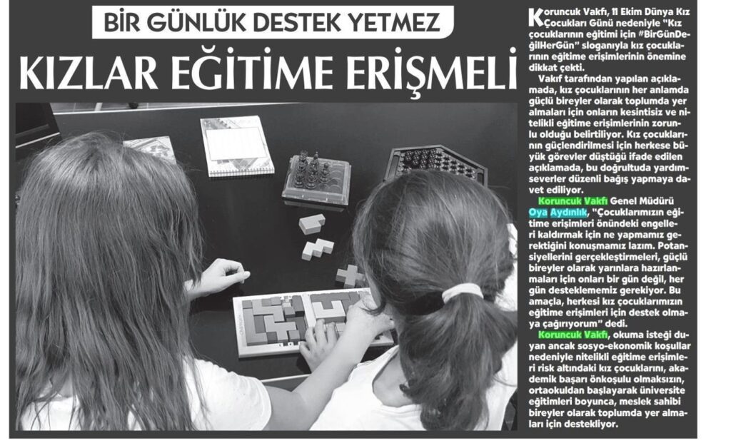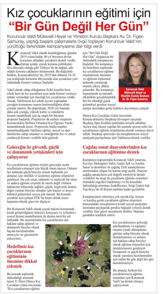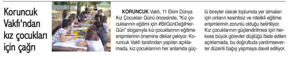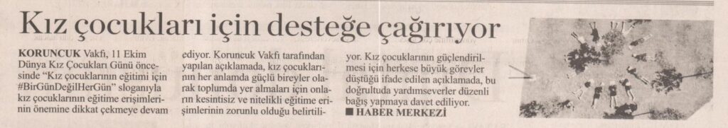 11 Ekim Dünya Kız Çocukları Günü kapsamında “kız çocuklarının eğitimi için #BirGünDeğilHerGün” sloganlı kampanya haberimiz Milliyet Gazetesi’nde yayımlandı.