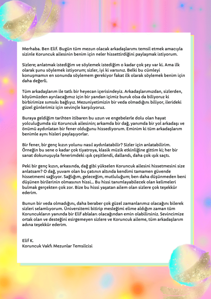 Koruncuk Vakfı Mezunlar Temsilcisi Elif K. tüm mezun olacak arkadaşlarını temsil etmek amacıyla duygularını kaleme alarak, mektubunda şu sözlere yer verdi: